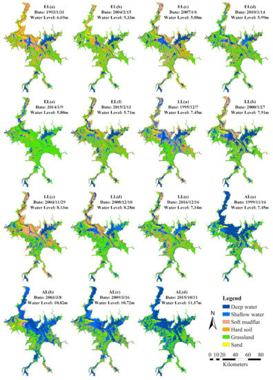 - Wang, S.; Zhang, L.; Zhang, H.; Han, X.; Zhang, L. Spatial–Temporal Wetland Landcover Changes of Poyang Lake Derived from Landsat and HJ-1A/B Data in the Dry Season from 1973–2019. Remote Sens. 2020, 12, 1595. [Google Scholar] [CrossRef]