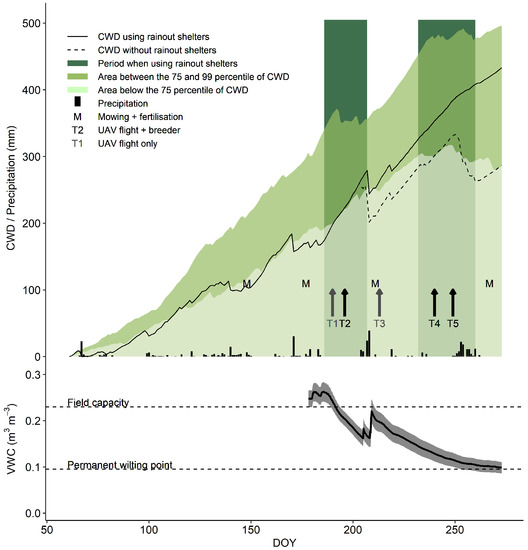 The rainout shelters were moved over the experimental field during two periods of the 2013 summer season (from DOY 186 until 207 and from DOY 232 until 260, Figure 2). In-between these two periods, plants were mown and fertilized, and were exposed to two rain events to allow the fertilizer to dissolve. Before, during and after the drought periods, meteorological conditions were recorded using a temperature + relative humidity (RH) probe (CS215, Campbell Scientific, Inc., Logan, UT, USA), a precipitation sensor (ARG100, Campbell Scientific, Inc., Logan, UT, USA) and a pyranometer (LP02, Hukseflux, The Netherlands) installed about 15 m from the experimental set-up. Furthermore, the volumetric water content of the soil (VWC in m m) was monitored continuously for the 10–40 cm depth at 6 locations per rainout shelter (18 in total) using Time Domain Reflectometry sensors (type CS616, Campbell Scientific Inc., UK) (Figure 2).