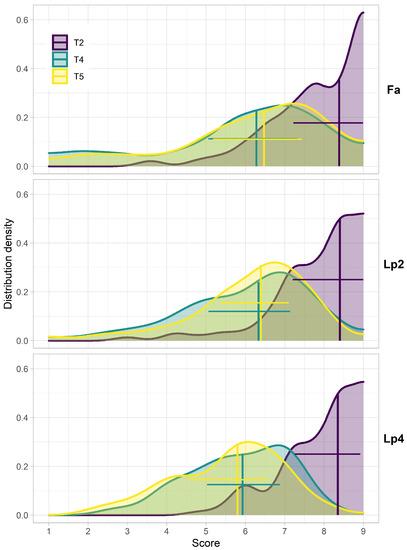 The distributions of the breeder scores showed that for all species (Fa, Lp2 and Lp4), the median values of the breeder score were highest at T2, at the start of the experiment (Figure 3). At T4 and T5, the spread on the scores increased compared to T2. At these time points (T4 and T5), the proportion of both the high scores (9) and the low scores (1) was substantially higher for Fa, compared to Lp2 and Lp4. For Fa, the median score at T5 was higher than at T4, whereas there was almost no difference between these two dates in Lp2. In Lp4 on the other hand, the median value at T5 was lower compared to T4.