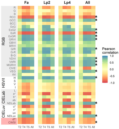 Pearson correlations between 37 different indices and the breeder score per species separately (Fa: Festuca arundinacea; Lp2: diploid Lolium perenne; Lp4: tetraploid Lolium perenne) and all species together (All) and per time point (T2, T4 and T5) and all time points together (All). The different indices are organized by sensor and colour space. Asterisks (*) point out indices of which the overall correlation was above 0.70 or below −0.70 and which were used for further analyses, along with CWSI.
