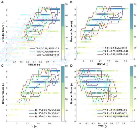 Density plots of H, NDLab, MGRVI, and CWSI (panels A–D) versus the breeder score, with linear regression (dashed line) and contour plot (full) per time point (T2, T4 and T5). Contours contain 75% of all data for this time point. R2 and RMSE (Root Mean Squared Errors—in breeder score units) are given for the regression at each time point.