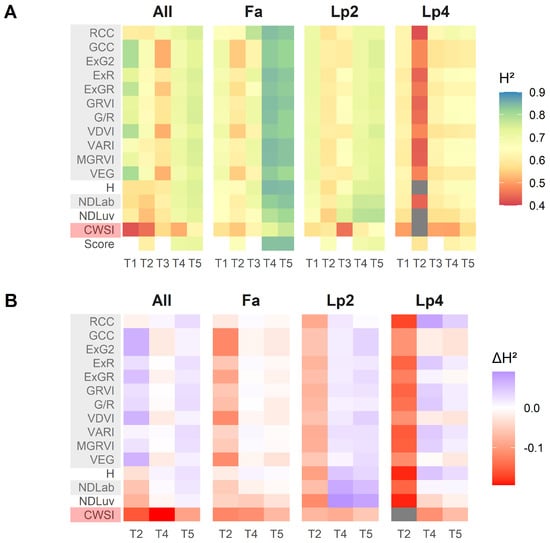 The difference in H2 () between the UAV indices and the breeder scores at T2, T4 and T5 (Figure 6B), was in all cases smaller than 0.2. For all species separately, H2 values of the breeder score were higher than the UAV indices at T2, but this was not the case when the data of all species were analysed together (Figure 6B “All”). The behaviour of the data at T4 and T5 was different for each species. For Lp2, all the visual-based indices tended to have higher than the breeder score, whereas for Fa the breeder score tended to perform slightly better than the visual-based indices. For Lp4, several indices outperformed the breeder score (e.g., RCC, ExR, GRVI, G/R, VARI, MGRVI and H), whereas others had lower (GCC, ExG2, VDVI, VEG), or similar values (ExGR, NDLab). When data of the three species were pooled, of the good performing VIs was as good as the breeder score at T4, and slightly better at T5. The thermal index CWSI had lower values than the breeder scores at any time point and any species.