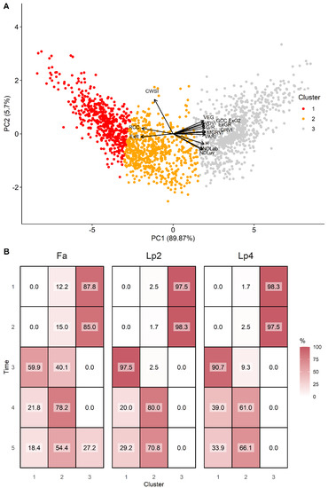 Results of the hierarchical cluster analysis, presented via the two major principal components (panel A). The distribution in % of the genotypes per time point (1–5) and per species (Fa: Festuca arundinacea; Lp2: diploid Lolium perenne; Lp4: tetraploid Lolium perenne) in the three clusters (panel B).