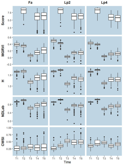 Boxplots represent the distribution per time point (T1–T5) and species (Fa: Festuca arundinacea; Lp2: diploid Lolium perenne; Lp4: tetraploid Lolium perenne) of the breeder score and four selected indices: MGRVI, H, NDLab and CWSI. Boxes are delimited by the 25th and 75th percentile, horizontal lines indicate the median values. Data are the mean values per genotype and are grouped per time point.