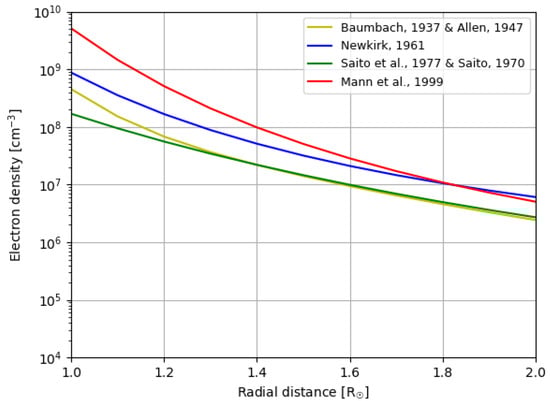 Compilation of generally used models of electron density in the solar corona presented by different authors. The lines correspond to: Baumbach, 1937 [], Allen, 1947 [], Newkirk, 1961 [], Saito et al., 1970 [], Saito et al., 1977 [] and Mann et al., 1999 []).