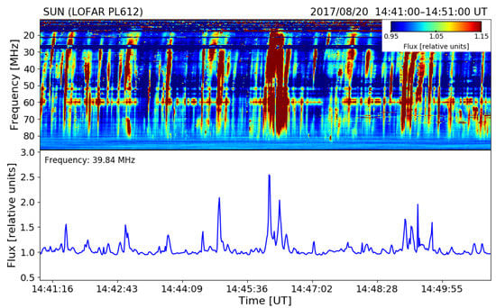 Spectroscopic solar observation with the use of the Bałdy LOFAR station (Poland) in a local mode, started from February 2017 []. Since then, observations are performed regularly, usually one or two days per week—the station runs also other observations programs, especially in the ILT (International LOFAR Telescope) mode. The temporal and frequency resolutions of observations presented here are 1 s and 0.39 MHz, respectively. The LOFAR single station has unique capabilities which are the (1) high frequency resolution, (2) high sensitivity, and (3) wide frequency bandwidth.