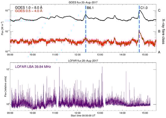 The GOES 1–8 Å and 0.5–4 Å fluxes recorded during the studied radio event with type III radio bursts. The upper panel shows GOES X-ray fluxes observed on 20th August 2017 from 9:00 to 15:30 UT. In this time GOES registered two solar flares B6.1 and C1.0 (the maxima of both of these flares were marked by the blue vertical dotted lines). The second panel shows the radio flux at 39.84 MHz frequency from LOFAR in the time of GOES’ registered flares. LOFAR observations were not continuous, therefore there are two gaps in the signal.