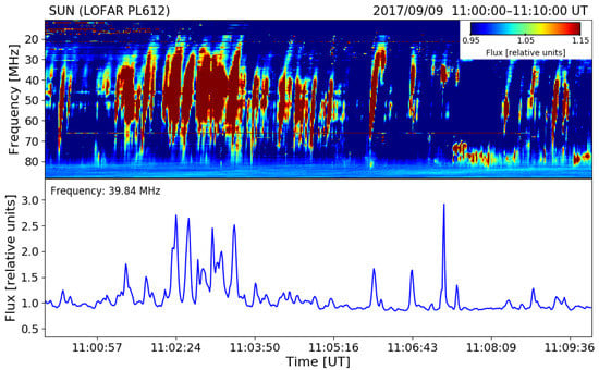Upper panel: a ten-minutes part of the solar dynamic spectrum of the storm of type III radio bursts recorded on 9th September 2017 with LOFAR Bałdy station. Bottom panel: radio flux at frequency of 39.84 MHz, extracted from dynamic spectrum on the upper panel, shows the time profiles of individual type III bursts.