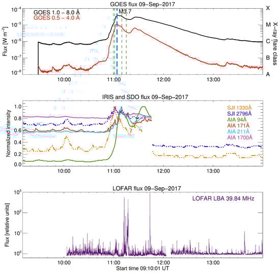 The comparison of the GOES X-ray and radio fluxes with IRIS and SDO UV signals during the radio event observed on 9th September 2017. The upper panel shows the GOES 1–8 Å and 0.5–4 Å fluxes observed from 9:10 to 14:00 UT. We can see an M3.7 solar flare with peak at 11:04 UT (marked by the blue vertical dotted line). The flare was also observed in the ultraviolet spectral range. The green vertical dotted lines indicate the moments for which we showed SJIs from the IRIS satellite in three passbands: 1330 Å, 2796 Å and 2832 Å on Figure 8. The middle panel shows the lightcurves determined from IRIS SJIs recorded in 1330 Å (orange dashed-dotted line) and 2796 Å (blue dashed-dotted line) passbands. IRIS observations were not continuous, therefore there is a gap in the signal. The panel also presents the lightcurves from SDO/AIA recorded in 94, 171, 211 and 1700 Å channels (green, red, blue and violet solid lines respectively). SDO observations ended at 11:46 UT. The third panel shows the radio flux at 39.84 MHz frequency from LOFAR in the time of GOES’ registered flare. LOFAR observations were not continuous, therefore there is a gap in the signal.