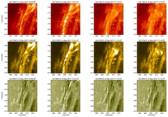 One of the three GOES solar flares which appeared during studied radio events was also registered by the IRIS and SDO satellites. It was an M3.7 GOES class solar flare registered on 9th September 2017 (Figure 7, second panel). One can see two peaks, the first one at 11:04 UT and the second one at 11:23 UT. The second peak appeared in the same active region, but it was not fully visible in the FOV of the SJIs. After these two peaks we observed gradual phase of the solar flare lasting over 2 hours. IRIS performed the observations from 5:20 to 11:36 UT and it contains the impulsive, maximum phase and part of the gradual phase of the flare. The observations contain SJIs in three passbands with a FOV arcsec—C II 1330 Å (transition region), Mg II k 2796 Å (chromosphere) and wing of the Mg II line centered at 2832 Å (photosphere). IRIS recorded 800 SJIs with a 28 s cadence in every passband (examples are showed on the Figure 8): 1330 Å—upper panel, 2796 Å—middle panel, 2832 Å—lower panel. In our research we used IRIS level 2 data, which are corrected for i.a. dark current, flat-field, geometric distortion and scattered light []. In the upper panel of Figure 7 we marked also moments, for which SDO/AIA maps were obtained (green vertical dotted lines). In the Figure 8 we can see the active region just before the flare triggered at 10:59 UT in the images at 1330 Å and 2796 Å. Some small brightenings in one of the sunspots in the photospheric filter are clearly visible. The flare ribbon was well visible in the IRIS maps at around 11:01 UT in the impulsive phase. After the flare onset, at 11:10 UT and 11:15 UT, the small flare loops system also appeared. There are no visible structures at 2832 Å in the photosphere layer. The characteristic feature of the SJIs is also worth mentioning. The bright vertical line in the middle of the transition region maps and the same line, but dark visible in the other maps (Figure 8), is a shadow of the slit of the IRIS spectrograph.