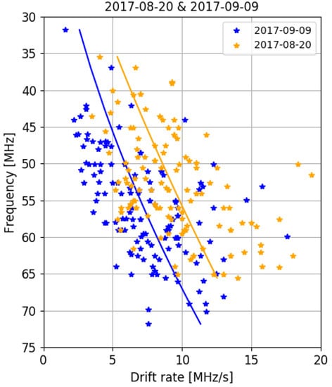 Figure 10 shows the drift rate change as a function of frequency for the studied events. The lines correspond with the power-law fit to the data. We found that the frequency drift rate for 124 type III bursts within 10–90 MHz for 20th August 2017 can be described by and the mean value of drift rate was MHz/s. The frequency drift rate for 131 type III bursts within 10–90 MHz for 9th September 2017 can be described by and the mean value of drift rate was MHz/s.