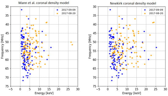 The energy of electrons exciting type III bursts amounts 6.09 keV and 9.55 keV (for Mann et al. model and Newkirk model, respectively) for radio event observed on 20th August 2017 is twice as large in comparison to the energy of electrons exciting type III bursts which is 3.16 keV and 4.83 keV (for Mann et al. model and Newkirk model, respectively) for radio event observed on 9th September 2017 (Figure 11). The results of our analyzes have been collected in Table 3.