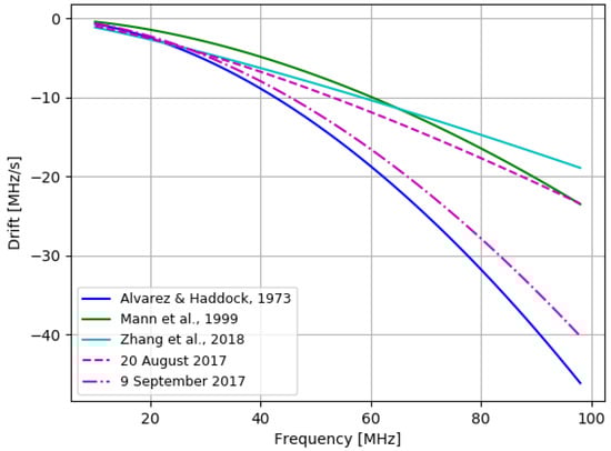 Comparison of drift rates versus frequency presented by different authors, listed in the Table 1. The dashed line correspond to the 20th August 2017 radio event and the dash-dot line to the 9th September 2017. We can see that drift rate for 20th August 2017 radio event is very similar to the drift rate obtained by [,]. On the other hand, the drift rate for 9th September 2017 radio event is very similar to the drift rate obtained by [].