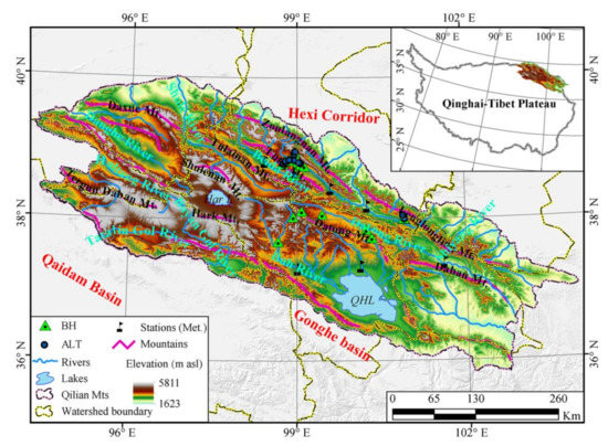 The QLMs is surrounded by the Altun Mountains in the west, the Qaidam and the Gonghe basins in the south, and the Hexi Corridor in the north. It is clamped by several sets of NNW-oriented large faults composed of parallel mountain chains and broad valleys. Governments and scientific communities have paid more and more attention to the QLMs since serious eco-environmental issues have weakened the role of the ecological barrier of the QLMs [35]. There are several confusing definitions regarding the geographical extent of the Qilian Mountains owing to no official delineating. In this study, we delineated the boundary of the QLMs in consideration of the mountain trends around this area and the division principles of other people (Figure 1). According to our watershed division principle, the latitude ranges from 35°49′N to 40°01′N and the longitude ranges from 94°23′E to 103°58′E in the QLMs, encompassing an area of 18.22 × 104 km2. The altitude in the QLMs ranges from 1576 m to 5763 m and is averaged at 3586 m [27], which is low in the surroundings and high in the central part, especially at the mountaintops. The QLMs is roughly composed of six watersheds and serves as the sources of six rivers, i.e., the Datong River ranking the second-order tributary of the Yellow River, the Shule River, the Shiyang River, the Heihe River, the Qinghai Lake, and the Qaidam Basin. There are two relatively large lakes in the QLMs—one is the Qinghai Lake, ranking as the largest lake across China with a surface area of 4829 km2 and lake level of 3198 m; and the other is the Hala Lake, with a surface area of 595.9 km2 and lake level of 4081 m, as obtained from the long-term sequence dataset of lake areas on the TP for 1970–2013 [53].