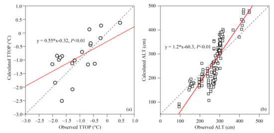 Comparisons of calculated temperature at the top of the permafrost or the bottom of the maximum frozen soil depth (MFSD) (TTOP) and measured TTOP (a), as well as calculated active layer thickness (ALT) and measured ALT (b), in the Qilian Mountains. Red line and dashed line demonstrate the linear trend and 1:1, respectively.