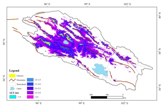 The ALT in the QLMs averaged over 2004–2019 is shown in Figure 6. In general, the calculated ALT in the QLMs ranges from 0.4 m to 3.6 m and is averaged at 2.51 ± 0.45 m. For the area around Hala Lake, the ALT decreases from 3.0 m near the lakeshore to less than 1.0 m away from the lake basin. The ALT distributed around Hala Lake is larger than 2.0 m. Resembling the spatial distribution of TTOP, the ALT is generally as thin as <1.0 m in the central parts, especially in the mountain ridges where the rivers originate, and gradually thickens to larger than 3.0 m towards the downstream of each watershed. It should be noted that, at the mountain ridges of the QLMs, there are some areas covered with LST that are lower than 0 °C all the time, indicating they are perennially covered by glaciers. We exclude these areas when calculating as they could not be treated as permafrost. Besides, there is no ALT value available for the central parts of the QLMs.