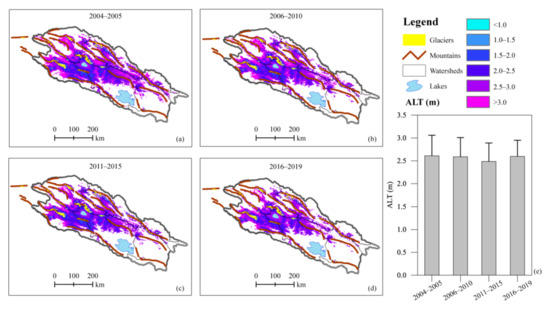 Although the permafrost in the QLMs varied considerably during 2004–2019 (Figure 5), the regional mean active layer thickness did not simultaneously change dramatically (Figure 7). The average ALT in the QLMs was 2.61 m, 2.59 m, 2.49 m, and 2.6 m over each five-year period of 2004–2005, 2006–2010, 2011–2015, and 2016–2019, respectively. However, the insignificant change of regional mean ALT may be because the permafrost with thicker ALT disappeared in the same period.