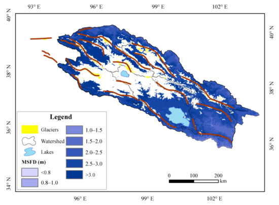 The spatial distribution of the MFSD in the seasonally frozen ground in the QLMs differs significantly from that of the ALT. As shown in Figure 8, the MFSD decreases from above 3.0 m to about 1.5 m in the seasonally frozen ground mainly located in the periphery of permafrost regions. The farther away from the permafrost regions, the smaller the MFSD. In the central parts of the QLMs, the MFSD values are only available in the lower valleys of the rivers, but are not available in most parts of this area as it is almost all covered by permafrost.