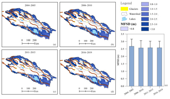 Unlike the trend of regional average ALT, the MFSD in the QLMs averaged over 2004–2019 showed a decreasing trend (Figure 9). The average MFSD was 2.68 ± 0.48 m, 2.57 ± 0.49 m, 2.58 ± 0.44 m, and 2.58 ± 0.48 m during 2004–2005, 2006–2010, 2011–2015, and 2016–2019, respectively.