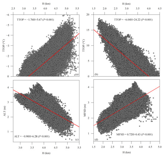 Correlation between altitude (H) and the temperature at the top of the permafrost (a) or the bottom of maximum frozen soil depth (b) (TTOP), active layer thickness (ALT) (c), and maximum frozen soil depth (MFSD) (d) in the Qilian Mountains.