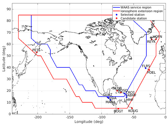 For the performance evaluation of the proposed method, we considered 15 IGS stations in the ionosphere extension region. The locations of those stations are shown in Figure 1. Because the east and west side of the WAAS service area is the sea, there were few IGS stations in the extended area, and most of them were in the south area. Ionosphere extension does not imply an extended service area. It represents the area where the extended ionosphere corrections are provided for a GNSS satellite, whose IPP is inside the extension area. For this reason, the feasible extension area was smaller than the ionosphere extension area. Prior to the stations’ selection process, the WAAS signal availability was analyzed at the candidate stations. GPS observations at those stations were used to find visible satellites, whose PRN was compared with the PRN in WAAS corrections to check if the WAAS correction was available for a specific satellite.