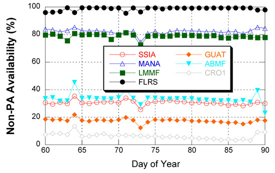 Figure 4 shows the NPA availability variation of seven selected stations in March 2015. The NPA availability was computed at each station on a daily basis. The one month mean of these values corresponds to the sixth column of Table 2. SSIA and MANA are close to each other but their PA/NPA availabilities were very different. At the boundary of the SBAS service area, a small distance change caused a large availability change. Another cause of the availability difference was the two stations’ observability difference. MANA station has a lower observability condition than SSIA does due to a wall in the west direction [28], which blocks GPS signals with a low elevation angle below 10 degrees in the west direction. The signal loss was identified by inspecting observation data at the MANA station. MANA station’s signal loss reduced its PA availability.