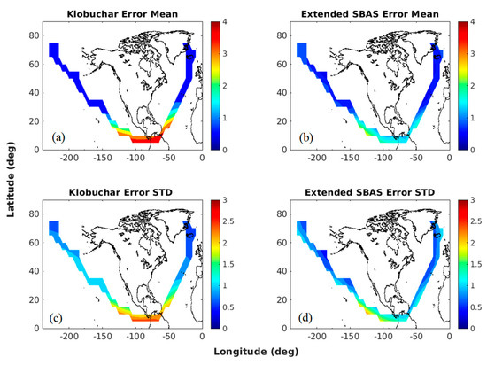 Figure 5 shows the mean and standard deviation of the extended SBAS ionosphere correction errors in the extension region. Ionospheric delay error statistics by GPS Klobuchar are presented for comparison. With one month of SBAS data, the ionospheric delay error was computed at each IGP point by subtracting the extended SBAS ionospheric delay from the IGS GIM ionospheric delay. The mean values of Figure 5a,b represent the absolute mean of the errors. The mean error level of extended SBAS ionosphere correction was far lower than that of the Klobuchar model, especially in low latitudes below 20°. The mean error reduction by the extended correction over the Klobuchar model was 23.4% but the reduction at low latitudes below 20° was 52.3%. In the high latitude, the magnitude of ionospheric delay itself was low and the accuracy improvement by the extended SBAS ionosphere correction was not significant. Similar accuracy improvement by the extended SBAS was shown in the error STD of Figure 5c,d. As well as the ionosphere error magnitude, the error variation was reduced by using the extended corrections. This period, March 2015, had a high ionospheric delay, and the Klobuchar model value was usually lower than the actual ionospheric delay value [26].