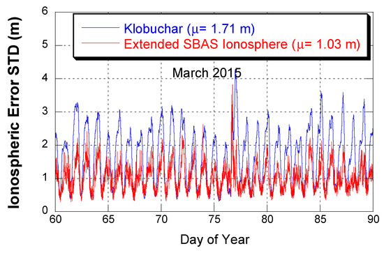 Figure 6 and Figure 7 show the time series of ionospheric error mean and STD in March 2015. The ionospheric delay errors at the extended IGPs were averaged for each epoch, every 300s seconds. From Figure 6, it is clear that the SBAS extrapolation reduced the ionosphere errors; the error mean was reduced by 23.4%. Reduction of the error STD was more significant, at 39.8%. Therefore, the use of the SBAS extended ionosphere was more effective in reducing error STD than in reducing error mean. Most of the error reduction occurred during the daytime when the ionospheric delay level was high. The maximum error was observed on March 17 when the St. Patrick’s Day ionosphere storm occurred. During this storm period, the error mean of the SBAS extension was similar to that of Klobuchar, but the error STD of the SBAS extension was lower than that of Klobuchar.
