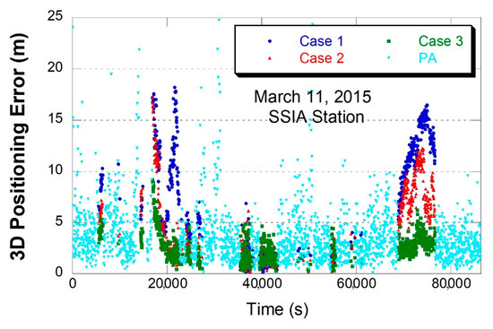 Figure 8 shows the position error time series at the SSIA station on 11 March 2015. The SBAS positioning mode selection depends on the availability of SBAS ionosphere correction. When four or more satellites could use all the SBAS corrections, both orbit/clock and ionosphere, PA mode positioning was used. Otherwise, the three positioning modes of Cases 1, 2, and 3 were used. The later cases still used orbit/clock corrections. The PA mode availability was 69.4% on this date. In some instances, PA mode had a large error, usually when only four satellite measurements were used. This plot clearly showed the accuracy improvement by the SBAS orbit/clock corrections (Cases 2 and 3) over GPS broadcast orbit/clock (Case 1). The extended ionosphere correction of Case 3 improved the accuracy especially during the large positioning error period around 20,000 s and 72,000 s. The improvement in positioning accuracy was not observed between 30,000 s and 60,000 s, since the time range corresponded to the night time of the SSIA station (UTC -6 h). In other words, the improvement in positioning accuracy was not significant when the ionospheric delay was small.