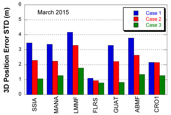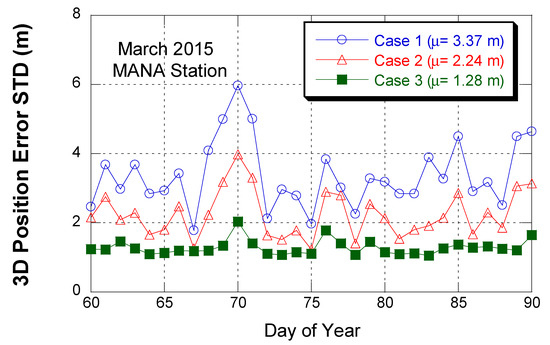 Figure 9 shows the variation of the position error STD at MANA station in March 2015. Daily positioning error STD was computed for the NPA period, which accounted for 84.4% of all data periods. As seen above, cases 1 and 2 had a large variation but Case 2 had a lower magnitude. However, Case 3 had a much lower variation than Cases 1 and 2, and it established the ionospheric delay error was a dominant error source in single-frequency GNSS positioning.