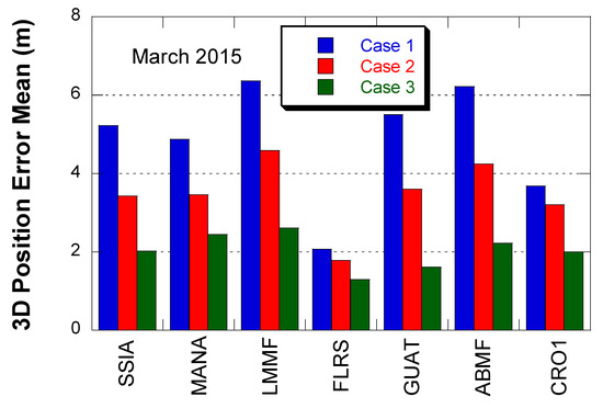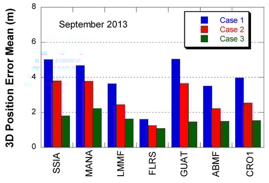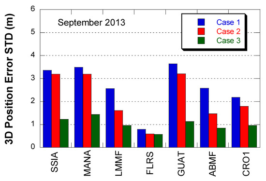 Figure 12 and Figure 13 show the mean and STD of 3D positioning error with one month of data in September 2013. The overall error level was slightly lower than the March 2015 results, but the error reduction from Case 2 to 3 was still significant. The positioning error reduction from Case 2 to 3 was 43.0% in mean and 52.6% in STD. CRO1 is inside the WAAS service area but showed a similar error reduction.