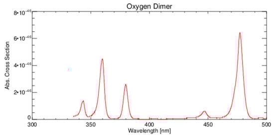 The principal atmospheric components that absorb sunlight in the UV–Vis region are ozone (O3), sulfur dioxide (SO2), nitrogen dioxide (NO2), formaldehyde (HCHO), bromine monoxide (BrO), water vapor (H2O), and aerosols. In addition to these trace gases, absorption occurs broadly due to the collisions between oxygen molecules, which are named oxygen dimers (hereafter, O2–O2) [,]. The absorption cross-sections of the oxygen dimer are shown in Figure 1. As can be seen in Figure 1, there are several strong absorption bands centered at 344.0, 360.7, 380.2, 446.7, and 477.0 nm within the 300–500 nm spectral range, the strongest of which occurred at around 477 nm with a full width at half maximum (FWHM) = 5.39 nm (at 293K) []. At wavelengths outside of 460 and 490 nm of the absorption band of 477 nm, the absorption effect of O2–O2 is very small and can be negligible.