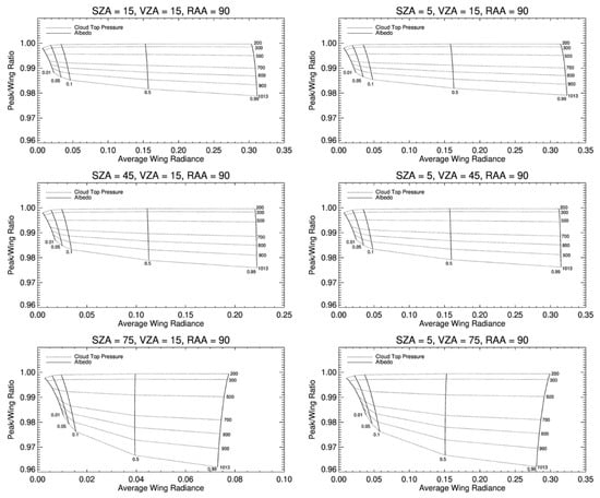 Change of peak/wing ratio according to average wing radiance for various geometric angles. The solid lines indicate a surface albedo of 0.01, 0.05, 0.1, 0.5, and 0.99 (from left to right), and the dotted lines indicate the cloud top pressure (CTP) of 1013, 900, 800, 700, 500, 300, and 200 hPa (from bottom to top), respectively.