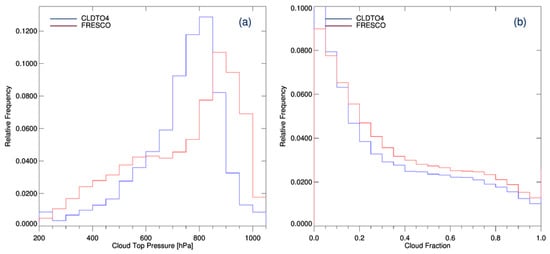 Probability distribution of (a) CTP and (b) CF by CLDTO4 and FRESCO.