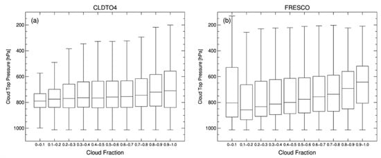 Boxplot of distribution of CTP as function of CF for each cloud retrieval algorithm: (a) CLDTO4 and (b) FRESCO.
