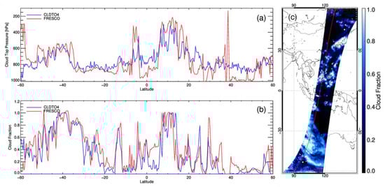 Intercomparison of (a) CTP and (b) CF was retrieved from CLDTO4 and FRESCO. The cross-section is a GOME-2 orbit as a function of the latitude from 0108 to 0250 UTC on 20 September 2016. (c) The trajectory of the over-passed track of GOME-2. The track line used in (a,b) is represented as a red line. The overlapped background image is the CF of CLDTO4.