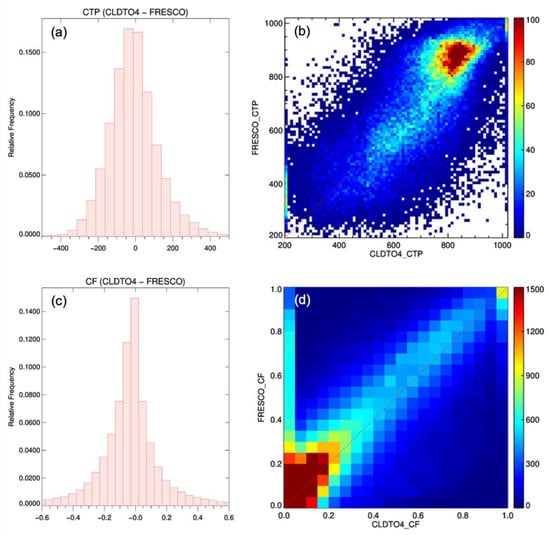 Figure 7 presents the comparison of the results between CLDTO4 and FRESCO for CTP and CF as a histogram of bias and a density scatterplot. These are the results for all of the outputs from the GOME-2 observations shown in Figure 3. As mentioned earlier, the CTP retrieved by CLDTO4 tended to be underestimated in the clear region (CF < 0.2) compared to FRESCO. In particular, the difference wase up to 100 hPa for low clouds, where FRESCO’s CTP is 800–900 hPa (Figure 7b). The retrieved values of CF obtained using CLDTO4 were very similar to those retrieved using FRESCO, except in some high-latitude regions with bright surfaces. This is because a ground surface with high reflectivity (e.g., snow or ice) can be mistaken for clouds. Both algorithm results for CF almost followed the 1:1 line, although the CF of FRESCO was slightly large. The biases in CTP and CF had a Gaussian distribution. The statistical results for CTP and CF are summarized in Table 3. For all sky, in the case of CTP, the correlation coefficient, bias, root mean square error (RMSE), and mean absolute error (MAE) were 0.74, −3.56, 77.5, and 34.75, respectively. For CF, the correlation coefficient, bias, RMSE, and MAE were 0.67, 0.11, 0.11, and 0.05, respectively. Furthermore, where the presence of clouds was significant (CF > 50%), the two algorithms showed better agreement. The correlation coefficient, bias, RMSE, and MAE for CTP were 0.79, −2.32, 48.61, and 15.56, respectively. This indicates that the CLDTO4 method provides cloud information with a high level of accuracy that matches that of FRESCO.
