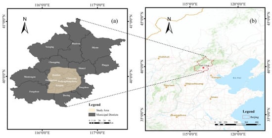(a) Location of the study area and the municipal districts of Beijing. (b)The location of Beijing in China. The base map is from ChinaOnlineCommunityENG (MapServer).