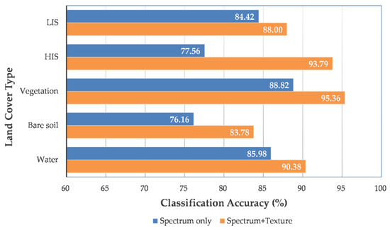Figure 3 shows the classification accuracy of land cover based on the spectral features only and using the spectral and textural features simultaneously. Based on the spectral features, the highest accuracy is for vegetation at 88.82%, while the lowest accuracy is for bare soil with only about 76.16%. When introducing the textural features, the classification accuracy was improved for all the land cover types. The accuracies of the vegetation and bare soil are up to 95.36% and 83.78%, which is an increase of 6.54% and 7.62%, respectively. The most significant improvement was obtained in the accuracy of HIS, which is an increase of 16.23% from 77.56% to 93.79%, and the improvement of bare soil ranked second highest. On the other hand, the accuracy of LIS classification only increases by 3.58%, from 84.42% to 88%, which is lower than the 4.4% of water. Compared to the classification strategy using the spectral features only, the Kappa coefficient evaluated based on the strategy combining the spectral and textural features increased from 0.694 to 0.850. This result proved that the spatial information reflected by the textural features plays an important role in extracting the surface information. Moreover, the improvement in the accuracy after introducing textural features is the most significant for the HIS.