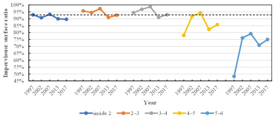 Thus, the inner three regions inside the fourth ring road can be considered highly urbanized areas compared to the outer two regions. The mean ISRs for the three regions from the inside out are 91.26%, 94.18%, and 94.74% (Table 5). The ISRs in the three regions all generally present a declining trend during the 20 years of development (Figure 6). Interestingly, the ISRs of the regions between the second and third ring roads and between the third and fourth ring roads finally declined to the initial ratio of the region within the second ring road in 2017, as shown by the dotted line in Figure 6. These results suggest that after the ISR reached a certain degree in the highly urbanized areas, the ratio starts to decline. A possible explanation for this result is that the citizens in the region pay more attention to improving landscapes as the urbanization finishes. For example, a series of greening projects have been conducted to the streets, community gardens, walls, and rooftops of buildings in Beijing since 2012 [44,45].