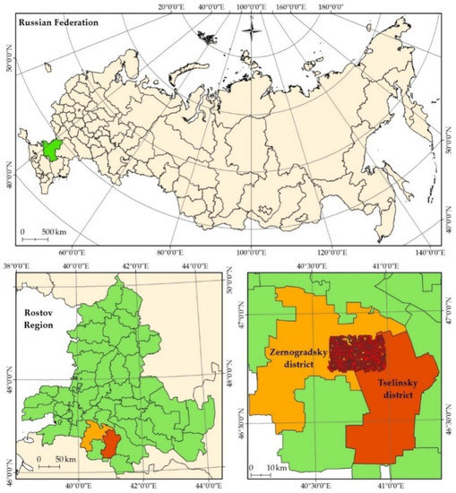 The studies were conducted on the territory of Russia in the Tselinsky and Zernogradsky districts of the Rostov Region (Figure 1). The soil cover is represented by low-humus thick ordinary calcareous chernozems, clayey and heavy loamy on loesslike clays (Haplic Chernozem (Loamic, Aric, Pachic)). Altitude is 100 m. The mean annual air temperature is 10.6 °C. The mean annual precipitation is 537.9 mm.