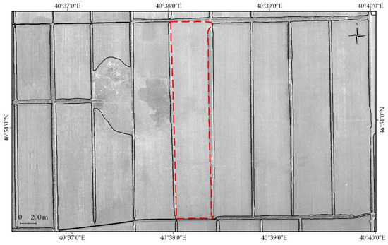 A fragment of the boundaries of agricultural fields on the orthophotomap (2012, the field for which examples in Tables S1 and S2 and on Figure 7 are given is highlighted in red).