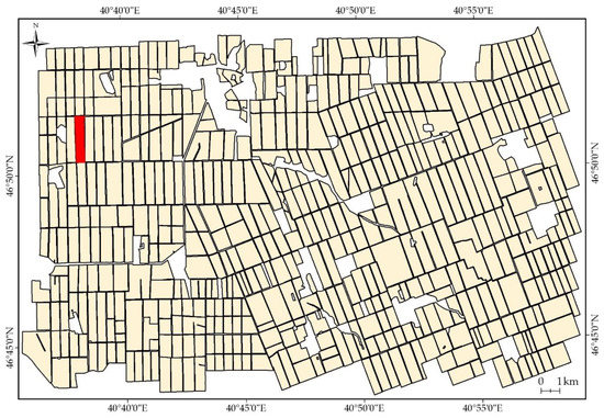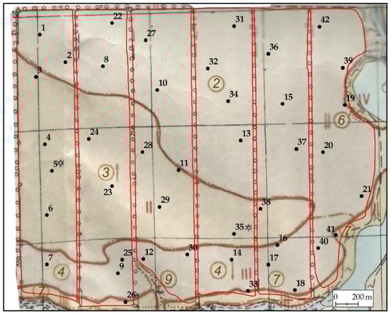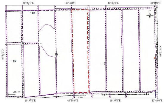 A fragment of the boundaries of agricultural fields on the topographic map (the field for which examples in Tables S1 and S2 and on Figure 7 are given is highlighted in red).