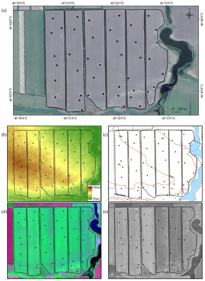 Fields of acceptance sample and points of soil pits location displayed on: (a) high resolution remote sensing data, (b) digital elevation model, (c) topographic map, (d) Landsat 8 scene (2014, band combination 7,5,3), (e) orthophotomap (2012).