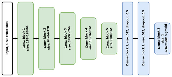 As shown in Figure 8 the proposed neural network contains five convolutional blocks and three fully connected layers. Each convolutional layer is followed by Batch Normalization layer. The kernel size of each layer is equal to 3 and the padding value is 1. As an activation function after all convolutional and fully connected layers we use the ReLUfunction. All blocks end with an average pooling layer with factor 2. Two dropout layers with probability 0.5 are used between two pairs of dense layers to prevent overfitting. As we are predicting the probability for the second class classification problem, the last fully connected layer of size 1 is followed by sigmoid activation function.