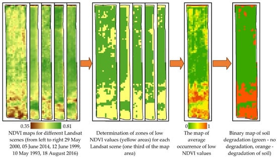 Detection of degraded lands can also be attributed to a variety of thematic interpretations [45,46]. For thematic interpretation, deep machine learning is currently used [47,48]. Learning is applied to the analysis of remote sensing data [49,50] or a set of characteristics using satellite imagery [45,46]. In the process of interpretation, areas of low values of vegetation indices are identified [23,24,25]. As a rule, these are areas of low productivity [47,50,51]. Areas of low productivity (low values of vegetation indices) can be fixed in the same places for a long period of time [51,52]. In this case, these sites can be indicators of the occurrence of soil degradation. Therefore, it can be assumed that when identifying areas of long-term average occurrence of low values of vegetation indices, it is possible to identify areas of soil degradation.