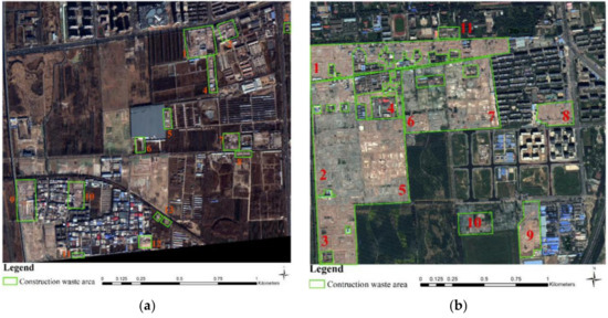 Additionally, we obtained GPS data points of construction waste accumulation locations through field surveys and identified the range and type of construction waste accumulation by using Google Earth images. According to the differences in the construction waste types and accumulation time in these areas, we found that there were 13 and 11 construction waste accumulation areas in cases A and B, respectively, as shown in Figure 2.