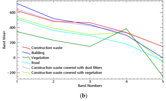 In case A, vegetation and roads could significantly be separated from other land features on all of the bands, but construction waste, buildings, and bare soil are more closely distributed, especially in the third band, as shown in Figure 3a. In other words, this type of distribution could lead to many commission classifications in the regular classification by spectral bands. It is worthwhile to note that the fifth band is the image processed by the morphological index, and construction waste, buildings and bare soil are obviously separated in terms of their spectral mean value in this band.