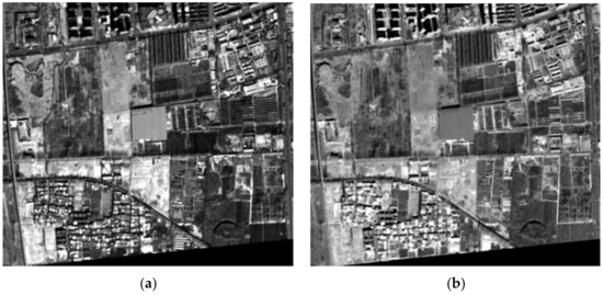 Usually, buildings have regular geometric features and texture features. Buildings with roofs and walls demolished have random shapes and rough textures that are similar to the features of the construction waste and have low contrast with construction waste. Additionally, the demolished buildings are scattered in the construction waste and the buildings. The above situation leads to confusion in the classification process after the adoption of spectral, geometric and texture features of images. Many scholars adopt different image processing methods to extract the target information. For example, principal component analysis [19], edge enhancement [20,21], morphological enhancement [22,23,24], and other methods are used to optimize the image features of the target objects and to simplify the complexity of the feature selection. A large number of experiments have proved that in the direction of addressing road detection [10], building information extraction [21], water area information detection [25,26], reef extraction, geological structure information extraction [27], and other applications, image enhancement is conducive to highlighting target image features, reducing redundant and interfering information, and improving the classification accuracy.