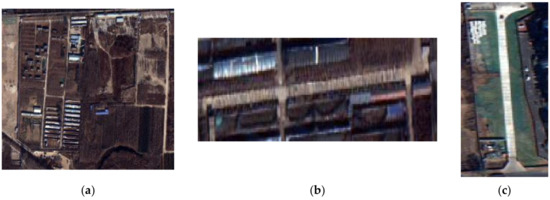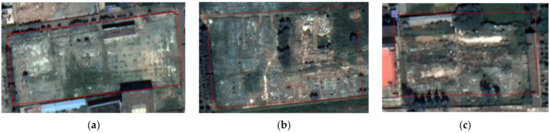 After the above classification operation, some image objects of buildings are still confused with construction waste. It is found in this paper that these easily confused building image objects are basically simple houses that are located near the construction waste area and have obvious brightness contrast with the nearby construction waste. However, the wide range of the brightness threshold of the construction waste will lead to many misclassification phenomena in the separation process. Therefore, GLCM contrast was used to separate such buildings, as shown in Figure 26. Figure 26a–c are the original images, and Figure 26d–f are separated simple houses. Finally, we used the red band to separate the vegetation, and roads appeared after re-segmentation, and we obtained the final construction waste extraction results.